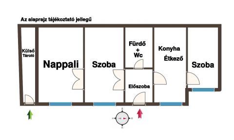 - Elrendezése: Nappali + 2 szoba, konyha, fürdőszoba + Wc, előszoba