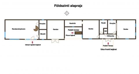 Az utcafronti házat egy tetővel összekötötték a 63 négyzetméter alapterületű hátsó gazdasági épülettel, ezáltal kialakult egy fedett terasz és itt található az igényes 10 négyzetméteres boltíves borospince lejárata is.