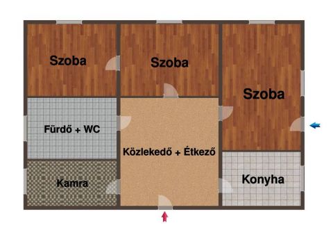 - 3 szoba, konyha, fürdőszoba, kamra, étkező