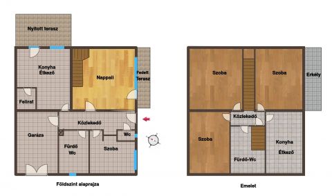 Jelenlegi elrendezésében 2 szinten összesen két konyha, öt szoba, két fürdő, két garázs található. Igény szerint a tetőtér beépíthető, melyhez a vezetékek már fel lettek víve, a lépcső kialakítása és a kartonozás, betonozás is megtörtént.