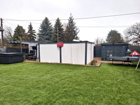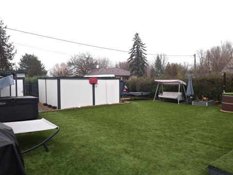 - Az udvar jelenleg műfűvel borított, de az automata öntöző ki van építve