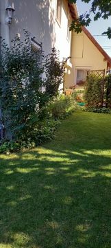 A házhoz egy könnyen rendben tartható, gondosan kialakított gyepesített kis kert és egy térkövezett udvar tartozik.