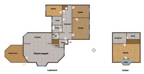A tetőtérben egy erkélyes szoba, és fürdőszoba található.