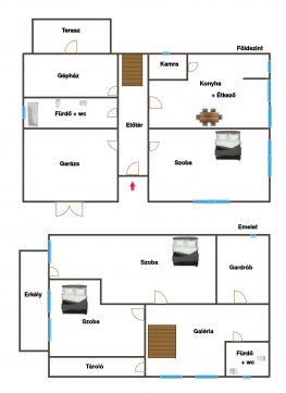 Az emeleten egy nappaliként funkcionált tágas terű galéria, 2 szoba, 2 gardrób, és egy zuhanyzós fürdőszoba kapott helyet.