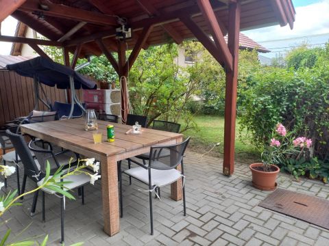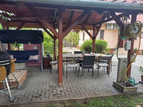 Öntözőrendszeres, füvesített kert a ház körül és szaletli a kerti összejövetelekhez
