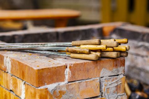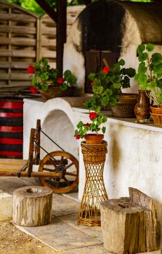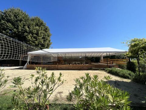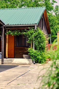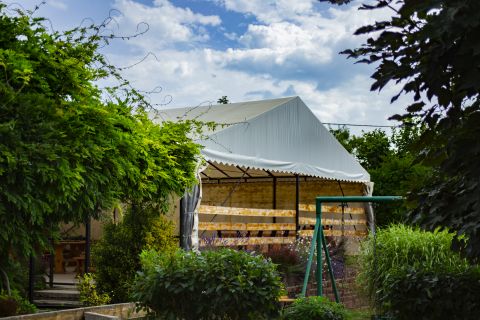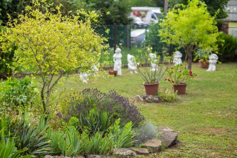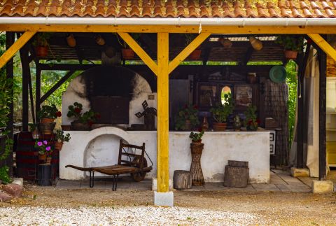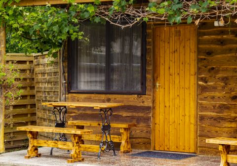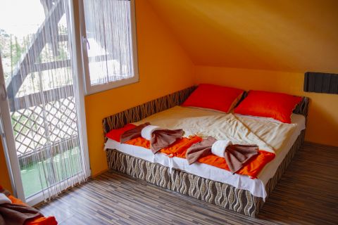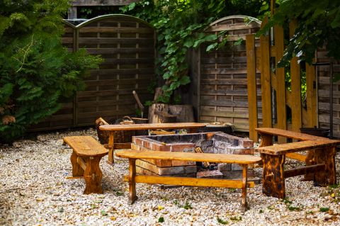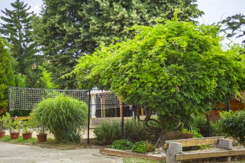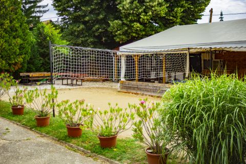 Rendezett kertrészben, dísznövények, fák, röplabda pálya, játszótér és egy fedett terasz rész található, mely 60-80 fő befogadására alkalmas.