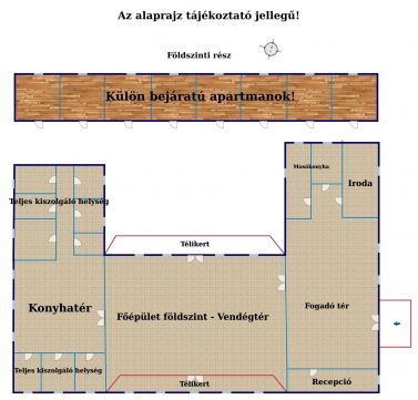 Az 1989-ben felújított, vörös kőből és B30-as téglából készült épületben minden megtalálható, amely a vendégfogadáshoz és vendéglátáshoz szükséges.