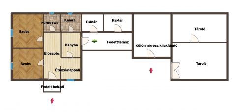 Kialakítása: 2 tágas utcafronti szoba, közlekedő, étkező, konyha, fürdő+wc, kamra, tágas fedett terasz. További raktár és műhely az udvaron, tároló és gépkocsibálló.
