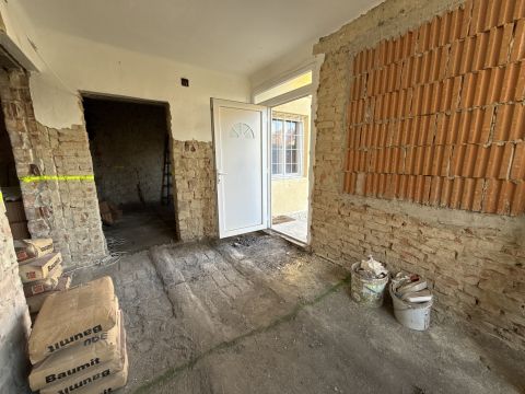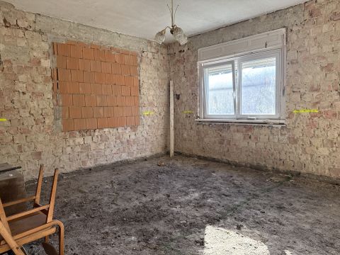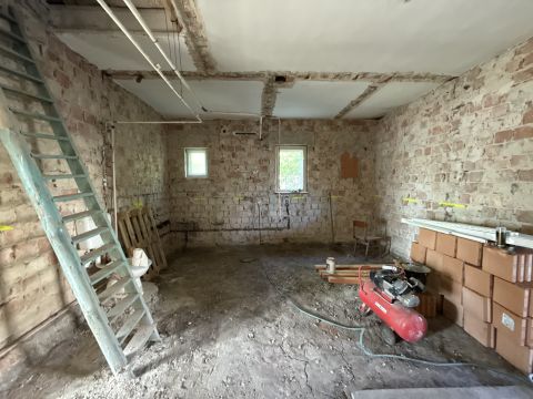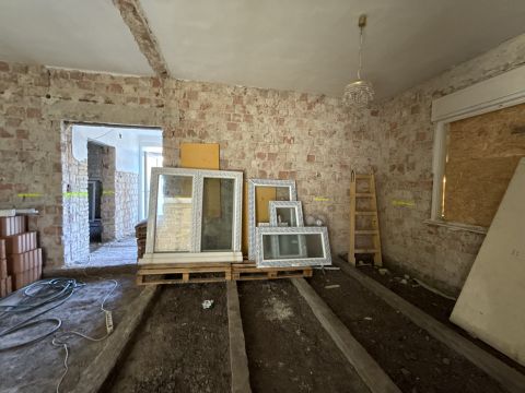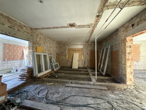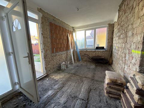 Falak tégláig visszabontva és az aljzat is .A mostani tulajdonosok padlófűtést szerettek volna minden helyiségbe kondenzációs gázkazánnal.