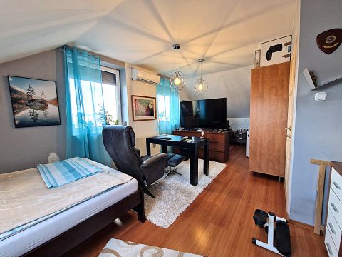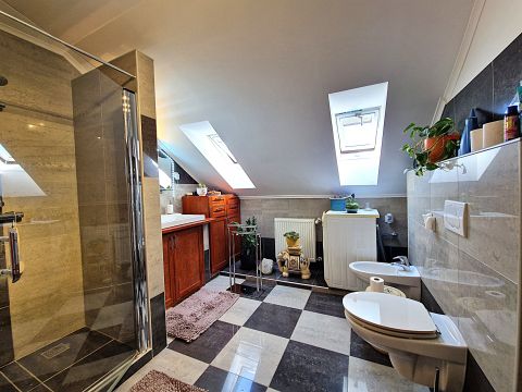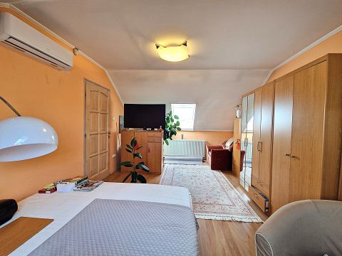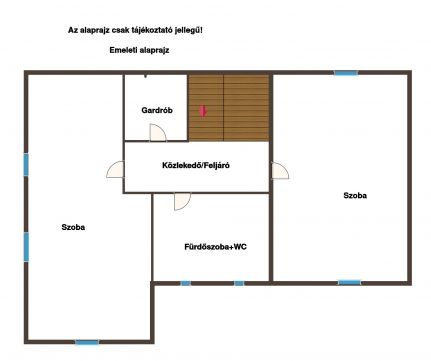 Az emeleten két kényelmes méretű szoba, egy gardrób és egy igényesen kialakított fürdőszoba kapott helyet.