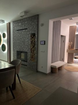 A házban található egy hangulatos kandalló is, ami meleg és otthonos légkört teremt.