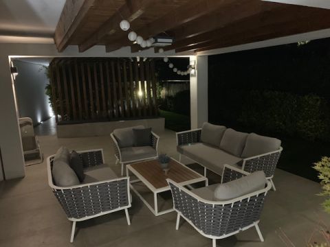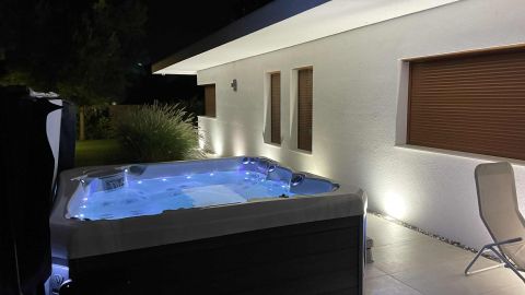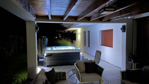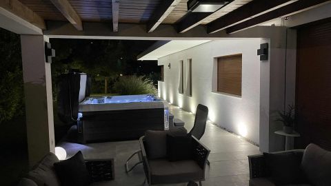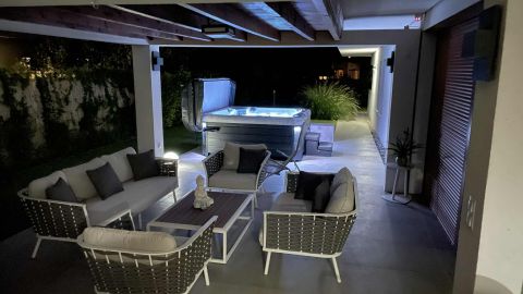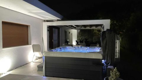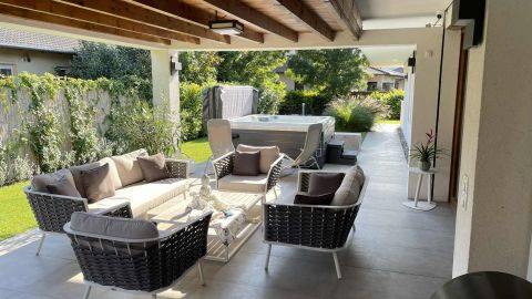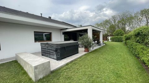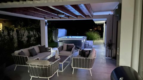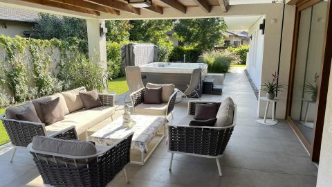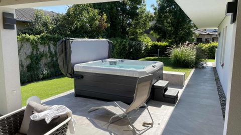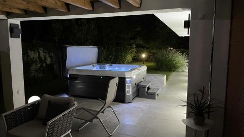 Az ingatlan egyik különleges eleme a 20 négyzetméteres fedett terasz, mely luxus kerti bútorokkal és egy 6 személyes, fűthető jakuzzival várja a pihenni vágyókat.