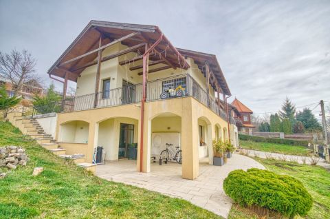 Az ingatlan tervezésekor figyelembe vették,hogy hegyvidéki környezetbe kerül kialakításra,így jött létre ezek a remek szint eltolásos ház.Az alsó szinten két autó részére fűtött garázs,tároló.mosókonyha,külön wc és külön fürdő,gardrób szoba és 3 külön nyíló szoba.Az emeleten egy majd 30 nm-es napfényes nappali,egy 21 nm-es étkező amely mellet egy igényesen kivitelezett és felszerelt 10 nm konyha készült el,illetve egy gardrób helyiség,egy fürdő és egy wc és még egy hálószoba.A tágas nappaliból és étkezőből a pilisi dombok panorámája terül elénk,jó idő esetén a Megyeri hídig is el lehet látni.Az ingatlan fűtése kondenzációs kazánnal illetve a nappaliban lévő kandallóval megoldható,a meleg víz ellátása a 220 literes puffertartály biztosítja,az elektromos hálózat 3x25 A.A parkosított zöld kertben a locsolást egy fúrt kút látja el,a telekre került még kialakításra a kerti szerszámok részére kis ház és egy fedett kerti ki ülő.