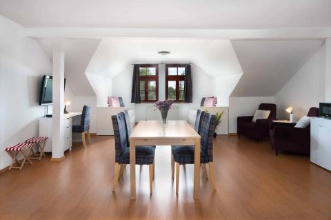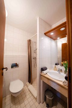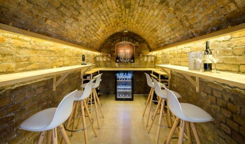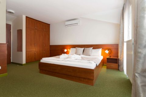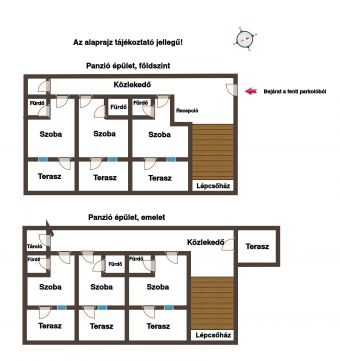 A felette elhelyezkedő két szinten összesen 6 apartman szoba került kialakításra, mindegyik saját fürdőszobával és erkéllyel rendelkezik.