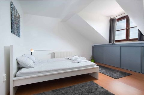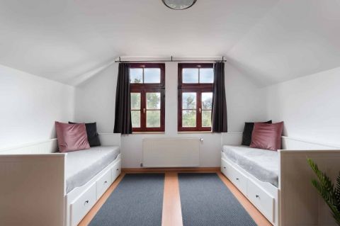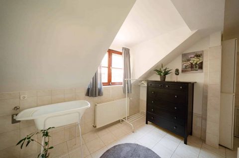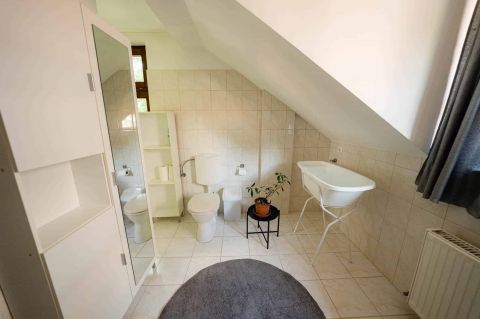 A tetőtérben három tágas szoba, közös fürdőszoba, valamint egy közösségi tér kapott helyet, amely kényelmes lakhatást vagy vendégelhelyezést biztosít.