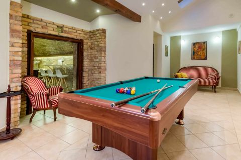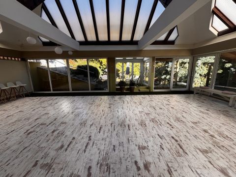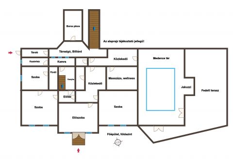 A lakóház földszintjén wellness részleg került kialakításra, amely magában foglalja a jakuzzit, többféle szaunát, masszázsszobát, öltözőket és zuhanyzókat, ideális privát vagy üzleti célú használatra egyaránt. Egy beltéri medence is kialakításra került, amely ideiglenesen le van fedve, és jelenleg rendezvény- illetve többfunkciós térként használják. A medence teljes gépészete megmaradt, így bármikor, jelentős átalakítás nélkül visszaalakítható eredeti állapotába, amennyiben az új tulajdonos ezt kívánja.