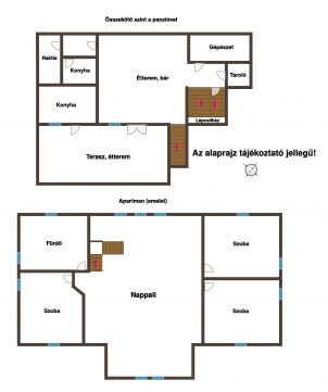 A panzió alsó szintjén közösségi és kiszolgáló helyiségek találhatók: étkező, társalgó, professzionálisan kialakított konyha, mosogató és személyzeti öltöző.