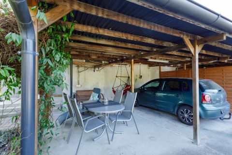 Az udvarban fedett autóbeálló található, a hatalmas kert pedig kiváló lehetőséget nyújt pihenésre, kertészkedésre vagy akár további fejlesztésekre.