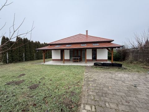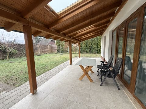 Az ingatlanhoz tartozó 990 m²-es telek rendszeresen karbantartott. A terasz a ház mögötti intim részen kapott helyet, teljes nyugalmat biztosítva.