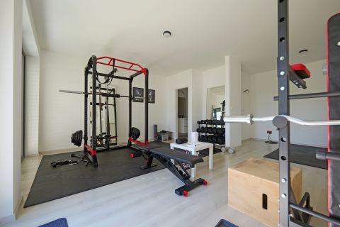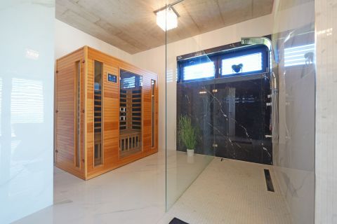 Emelet: szülői lakosztály gardróbbal és privát fürdővel, két gyerekszoba, 23 m²-es fürdő infra szaunával, plusz egy félszoba