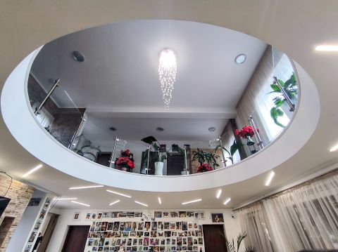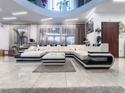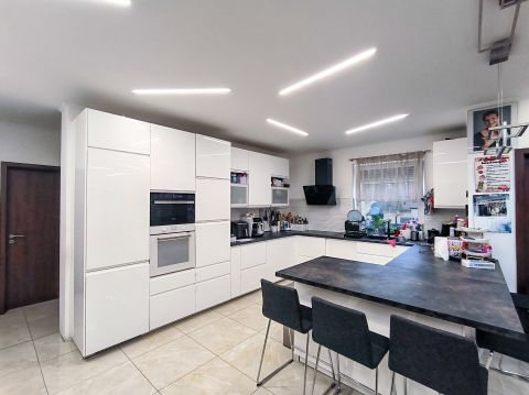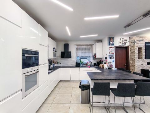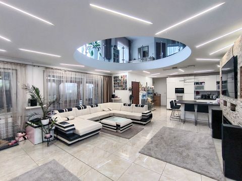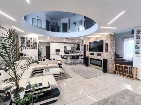 A tágas nappali és a beépített, modern konyha a családi élet központja LED hangulatvilágítás és nagy üvegfelületek teszik igazán otthonossá a teret.