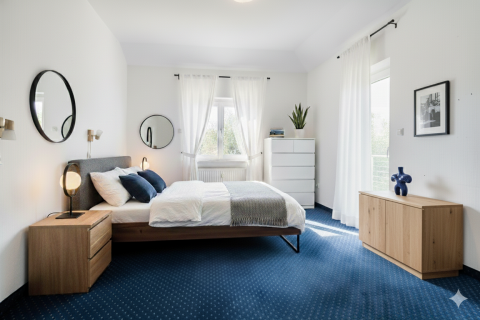 Emeleten három világos hálószoba osztozik egy modern, két terasszal kiegészített fürdőszobán. Innen nyílik a Pilisi Medencére néző örök panoráma. A hálószobákban légkondicionálás és új, szállodai minőségű padlószőnyeg biztosítja a kényelmet.