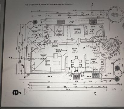 80 m²-es nappali + ameraikai tipusú konyha + étkező óriás ablakokkal a kertre (fényvédő fóliával)
