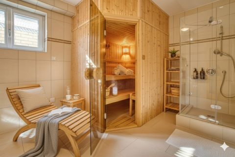 Alagsor igazi szabadidős zóna: itt kapott helyet a 5 személyes finn szauna, a két beállásos, műgyanta padlós garázs, valamint egy tágas, 60 m²-es tér könyvtárnak, mozi- vagy játszószobának.