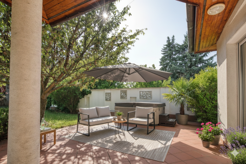 A kültéri élményt automata Rainbird öntözőrendszer, minőségi Semmelrock térkő és a fűthető szabadtéri jakuzzi teszi teljessé. A modern biztonságról riasztórendszer és elektromos redőnyök gondoskodnak.