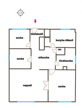 A jelenlegi elrendezés: Nappali + 3 hálószoba, konyha, előszoba.