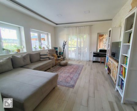 Az ingatlan elektromos fűtéses és 8 KW napkollektorral ellátott, tégla szerkezetű, 15 cm-es szigeteléssel rendelkezik, amely modern amerikai konyhás nappalival és további 3 hálószobával büszkélkedhet. Az ingatlanhoz tartozik még egy 30 nm-es fedett terasz , és egy mosó-konyha mellékhelyiséggel is , amely alatt pince található. Kialakításának köszönhetően nem csak az ingatlanból , hanem a teraszról is megközelíthető , így meghitt családi összejövetelnél praktikus is egyben .
