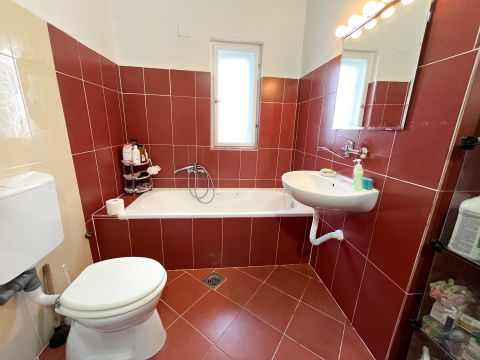 ahonnan kijárat nyílik a 75 m²-es, borostyánnal körülvett kertbe, a fürdőszoba, illetve egy