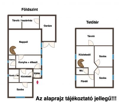 - 2 fürdőszoba: földszinten (felújítandó) és a tetőtérben