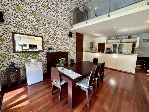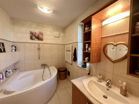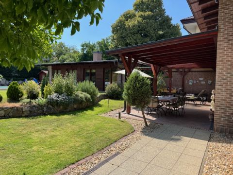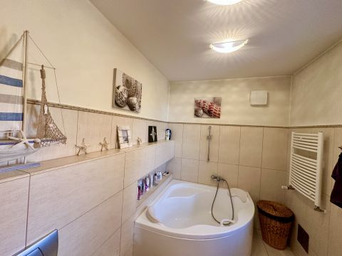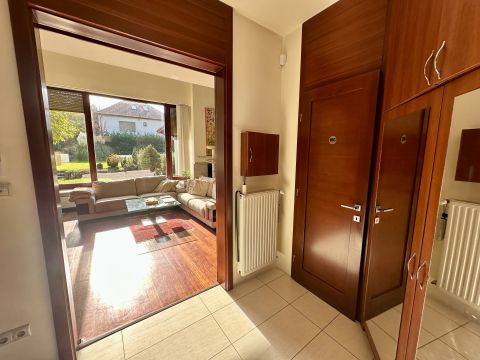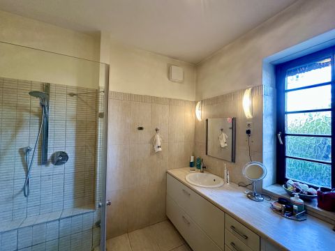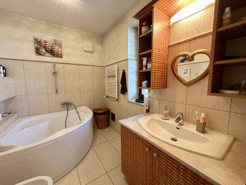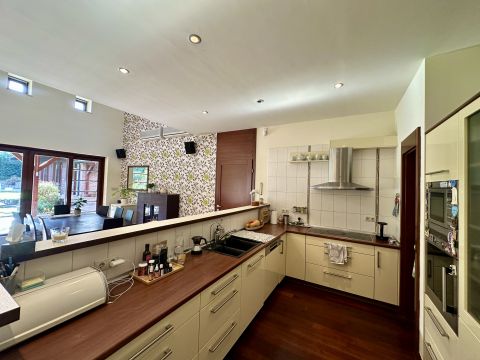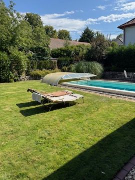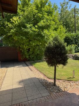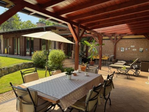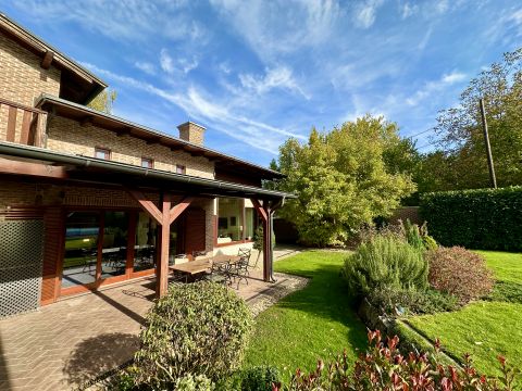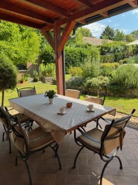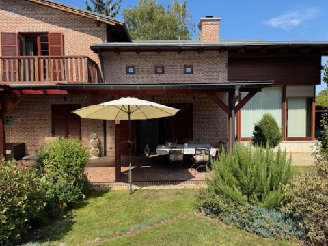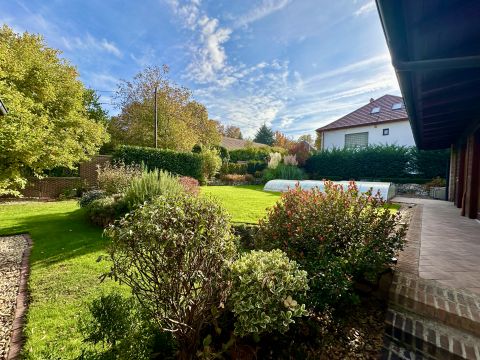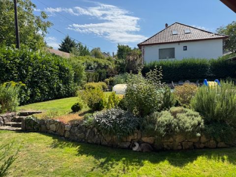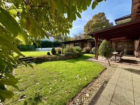 A gondozott kertben fűtött, fedett medence, valamint egy 15 m²-es wellness épület (szaunával) található. A ház mellett két autó számára fedett beálló áll rendelkezésre.