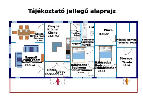 A ház központja a tágas nappaliétkező, amelyhez egy modern, konyhaszigetes konyha kapcsolódik. Az ingatlanban 2 teljes értékű fürdőszoba, 2 nagy hálószoba, valamint egy további, szabadon alakítható helyiség található (wellness, háztartási helyiség vagy plusz szoba).