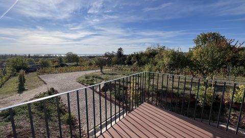 A teljes balatoni panorámával rendelkező ingatlanon, három, külön álló apartmanház lett kialakítva, melyek egyformán