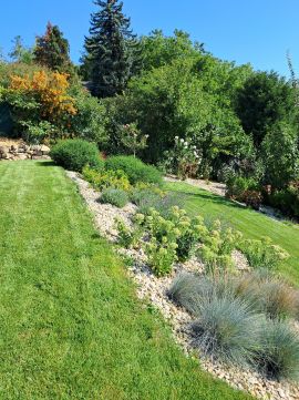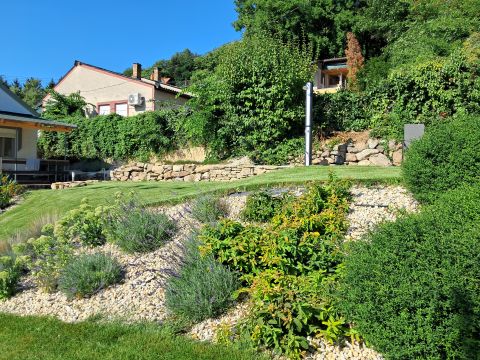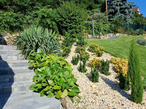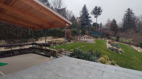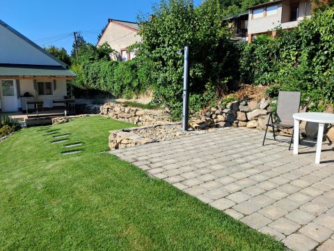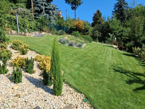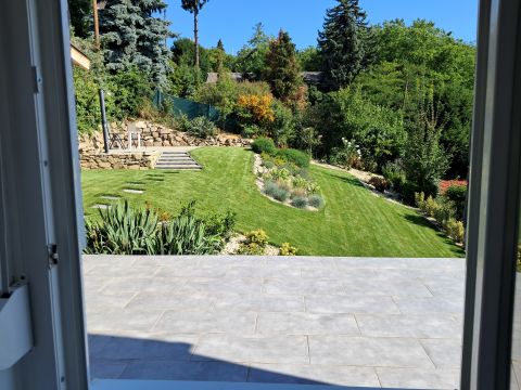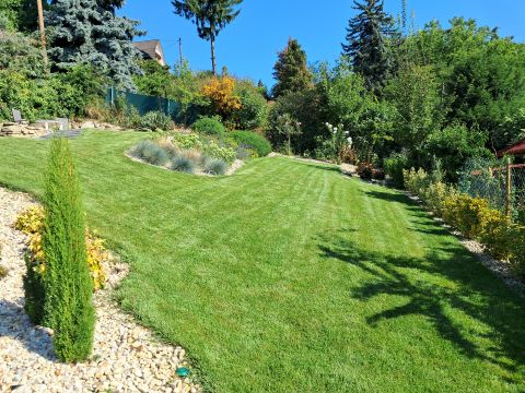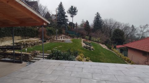 A terület 545m2. Az utcafrontról térkövezett autóbeálló fogad minket, ahol két autó tud parkolni. A kertet precíz tereprendezéssel alakították ki, hogy kihasználható legyen a lejtőssége miatt. A sziklakert és füves terület aránya megfelelő, melynek hosszútávú gondozását az öntözőrendszer könnyíti meg.