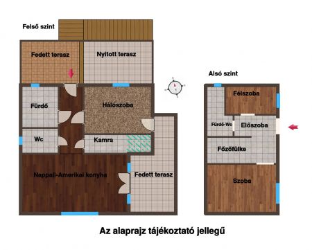Felső szint: 52m2 + 12,5m2 fedett terasz + 9m2 fedett terasz + 10m2 nyitott terasz