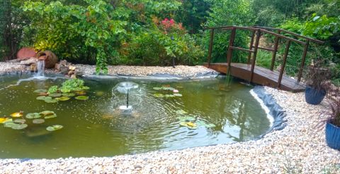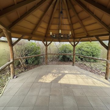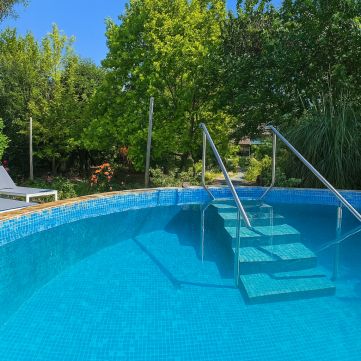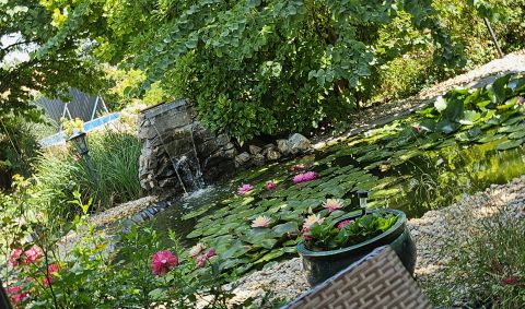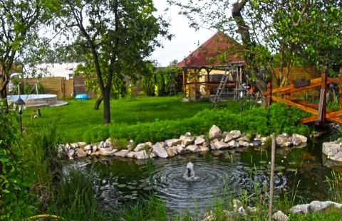 A dús növényzettel határolt udvaron két önálló pavilon, egy 5,5 méter átmérőjű, beépített kerek medence, továbbá szalonnasütő és bográcsozó hely, valamint egy esztétikai és mikroklíma-szempontból is értékes kerti tó díszíti a környezetet.