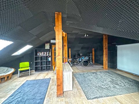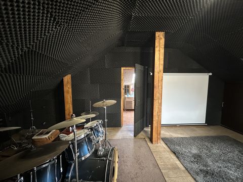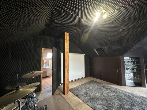 A tetőtérben egy hatalmas hangszigetelt nappali kapott helyet, amely jelenleg alkalmas zeneszobának vagy házimozinak.