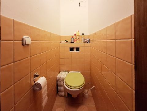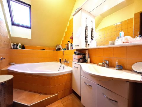 A napsárga csempével burkolt világos, tágas, sarokkádas kialakítású fürdőszobába a tetőablakon át bőséges napfény jut, a lépcsős megközelítésű sarokkád és a kád körüli pakolófelületek budoárérzést nyújtanak, napfürdőre adnak lehetőséget. Az emeleten külön apró helyiségben kapott helyet a WC.