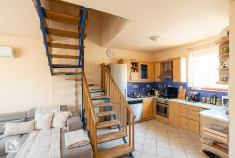 Az amúgy is világos, az utcai és udvari oldal felőli ablakok általi körbe-napozás miatt egész napon át napfényes nappali-étkező-konyha élettérből a jó idő kicsábítja az embert a szabadba. Erre lehetőséget nyújt az ugyancsak tágas teraszon elköltött családi ebéd, sütögetés vagy finom kávézás. A konyhai élettér az utcafronti ablakhoz közeli és hidegburkolattal ellátott. A nappali és étkező padlója diszkréten elválasztja egymástól a tágas életteret. A radiátoros fűtésen túl egy hűtő-fűtő klíma szolgálja a kellemes hőérzetet.