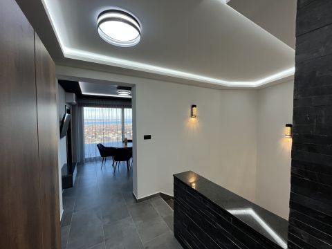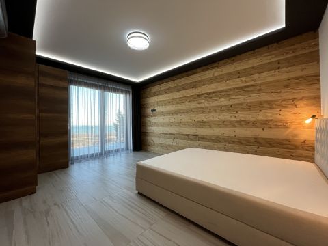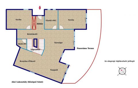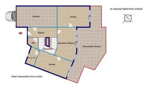 A felső szinten garázs, amerikai konyhás nappali, hálószoba, hálószoba fürdőszoba kapcsolattal, vendég mosdó, valamint egy 25 négyzetméteres panoráma terasz található.