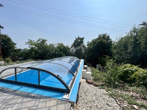 Az alsó szint rendelkezik udvari kijárattal, innen közelíthető meg a parkosított kertben elhelyezett FEDETT MEDENCE.