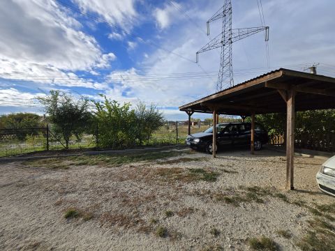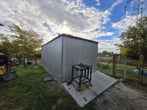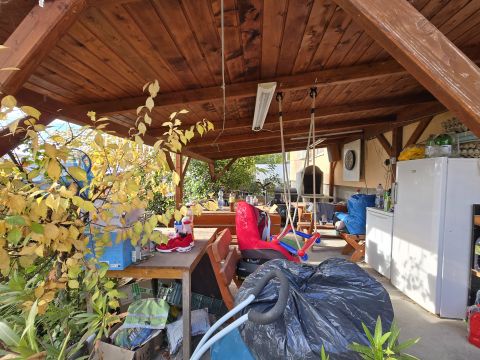 A kertben két beállásos, fedett kocsibeálló, valamint két fém lemeztároló helyiség található. A nagy, fedett terasz ideális a kültéri szórakozáshoz vagy családi grillezésekhez.