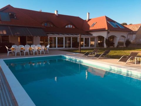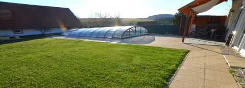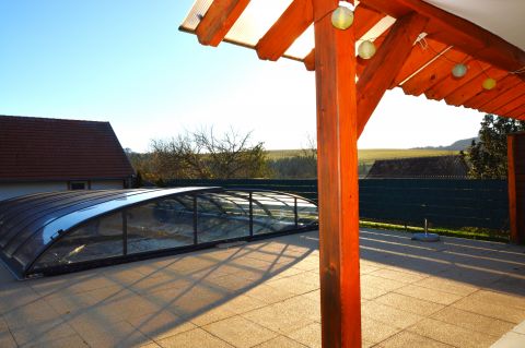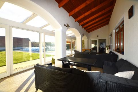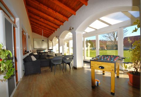 Fedett, zárt terasz 5 személyes jakuzzival, csocsóval és kertibútorokkal