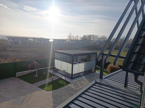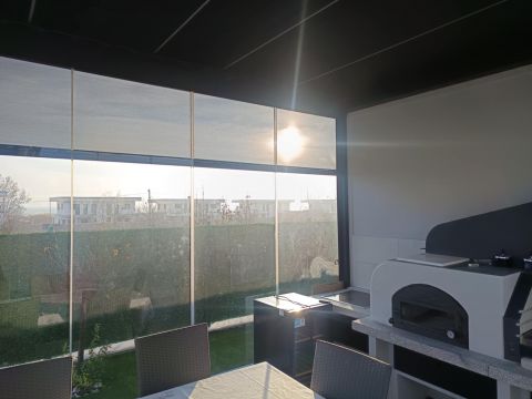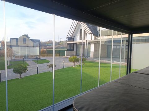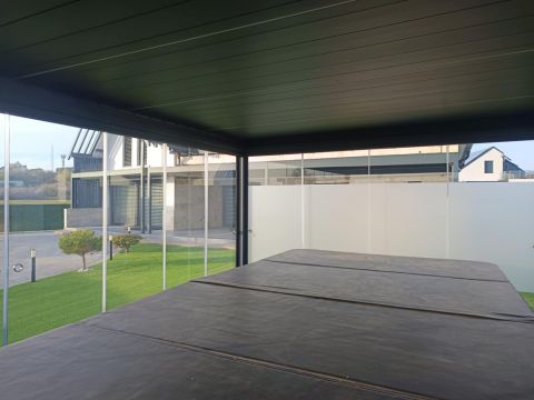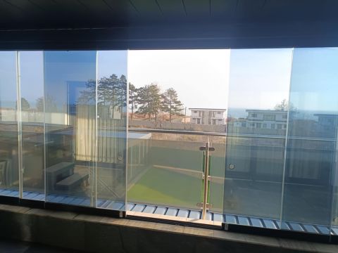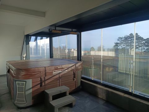 A felső szinten található egy teljesen beépített, magas minőségű üvegfelületekkel határolt, belátásmentes erkély, amely teljes egészében nyitható, így négy évszakos télikertként vagy közösségi térként is funkcionál.