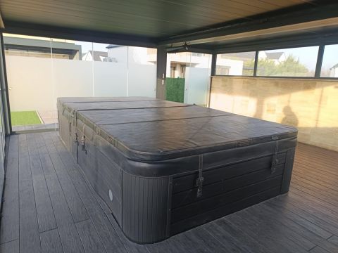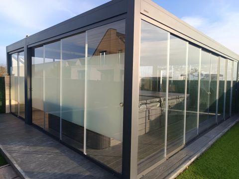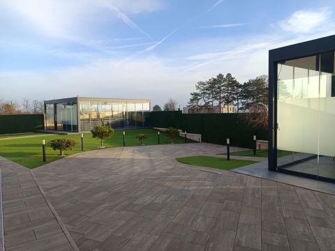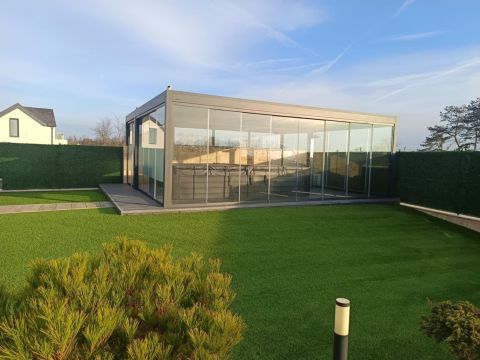 A telken helyet kapott egy 42 m²-es, teljes egészében üvegezett, pergolázott wellnesshelyiség is, motorizált tetővel és árnyékolással, amelyben a Wellis által gyártott ellenáramoltatós úszómedence található, külön hőszivattyúval és professzionális homokszűrő rendszerrel ellátva.