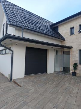 Az alsó szinten egy tágas garázs, egy elegáns vendégmosdó, valamint a hőszivattyú, napelemrendszer akkumulátorral és vízlágyító számára kialakított műszaki helyiség kapott helyet, amely mosókonyhaként is funkcionál.