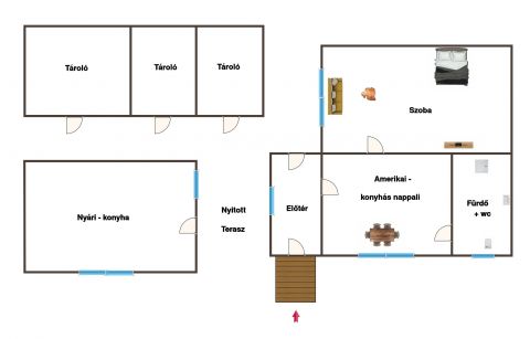 nyári konyha, 3 db tároló, nyitott terasz, pince.